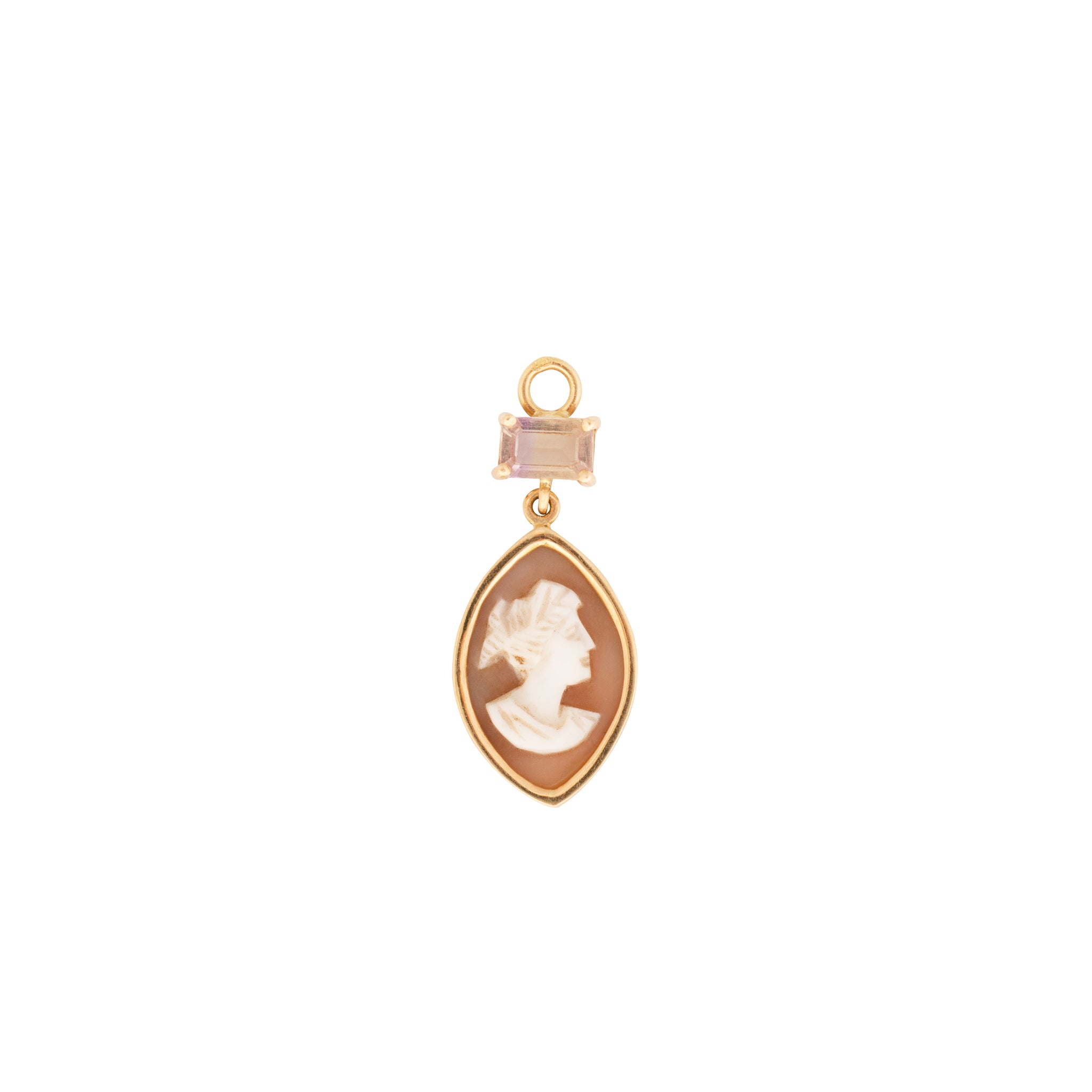 Versatile pear shaped antique cameo & emerald cut ametrine charm in 18k gold. Can be worn as a single earring, or attached to our link necklace or link bracelet. Charm link sold separately, needed for attaching the charm to our link necklace or link bracelet. Single Huggie sold separately needed for wearing the charm as a single earring.