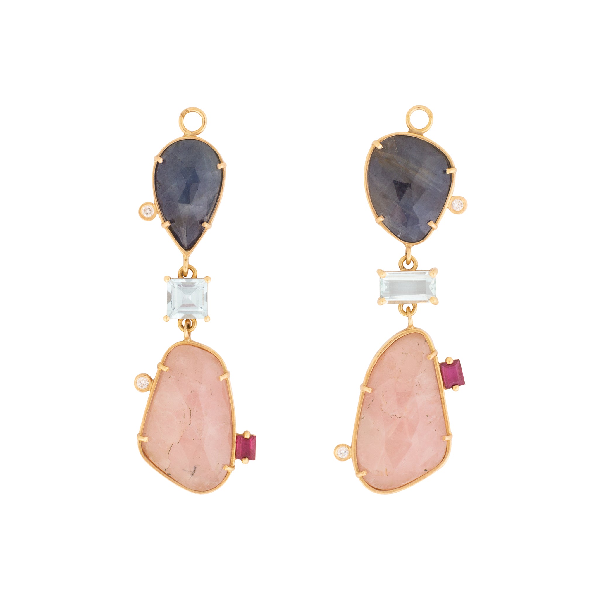 One of a kind asymmetric statement charms sold as a pair.  Blue rose cut sapphire, raw slice pink sapphire, brilliant diamonds, asymmetric blue topaz, rubies in 18k solid gold.  Huggie earrings are sold separately.  Can be added to the link chain necklace with our customised charm holder sold separately.