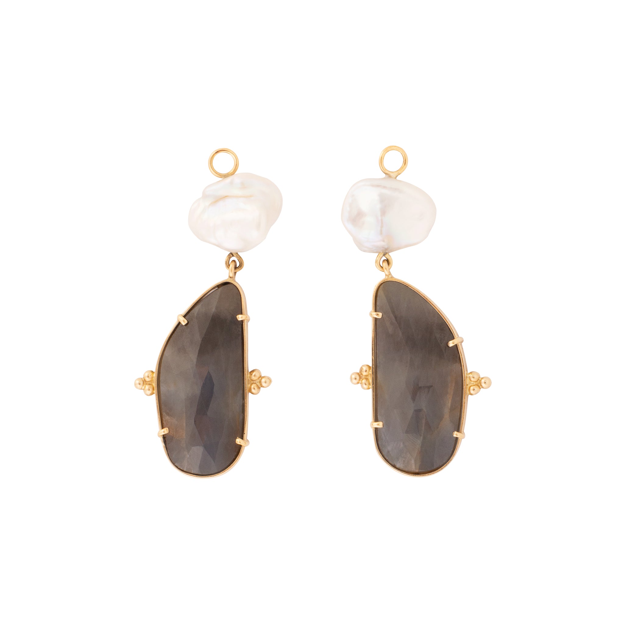 One of a kind asymmetric statement charms sold as a pair.  Irregular Pearl, raw grey/brown slice Sapphire in 18k solid gold. Huggie earrings are sold separately.  Can be added to the link chain necklace with our customised charm holder sold separately.