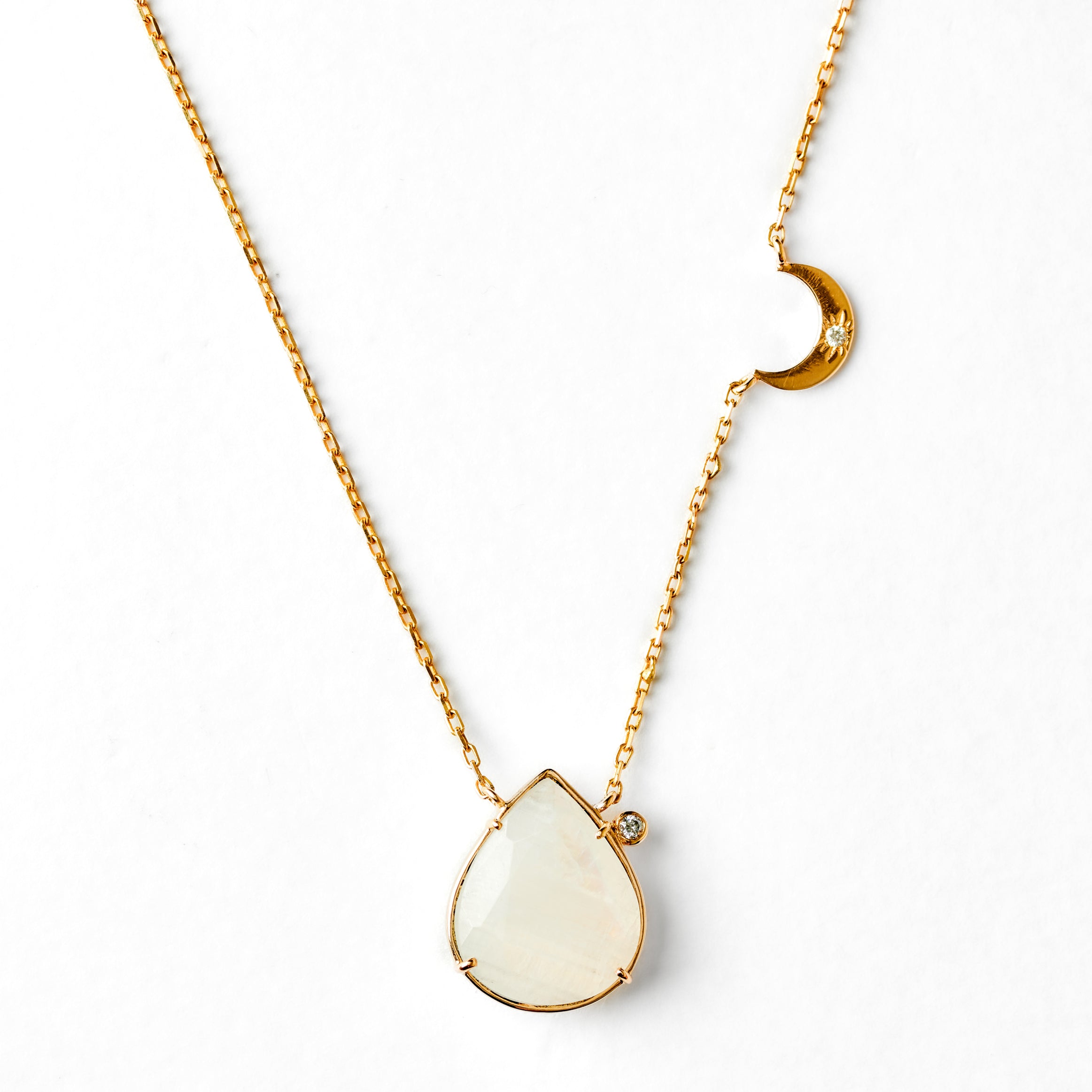 Radiant Pear shaped Moonstone and Diamond Necklace in 18k gold. Moonstone radiates a spectrum of shades in light.