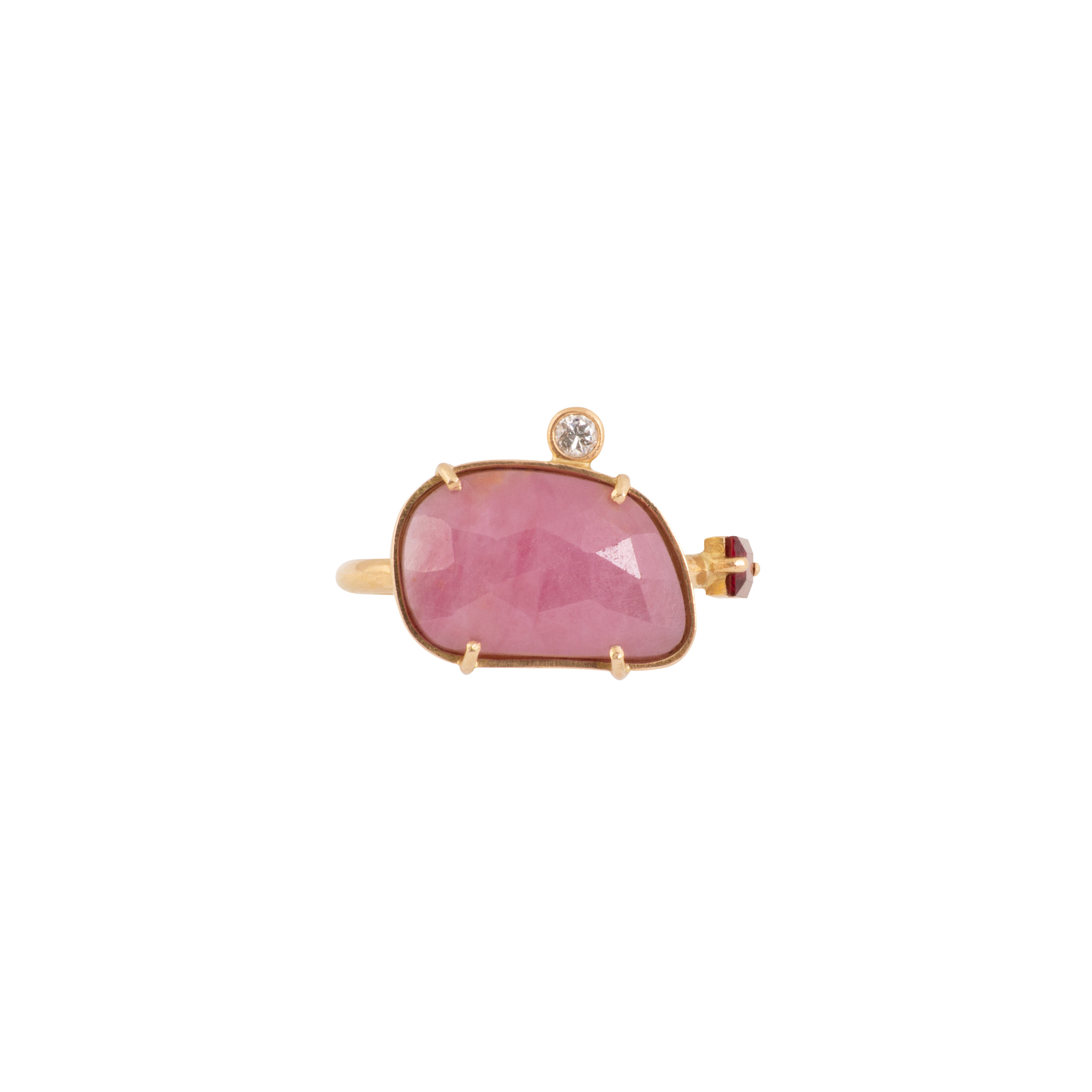 Our signature 18k gold rose cut pink sapphire, ruby, & diamond ring. Available in various sizes.  Please fill out the size with the help of our guide at checkout.